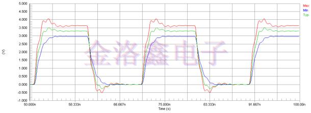 圖15:SiT8208跨過(guò)程角的Altium Designer仿真波形(在負(fù)載側(cè))使用星形拓?fù)潋?qū)動(dòng)兩條傳輸線(圖11).源處附加的15pF電容用于減慢信號(hào)邊沿.走線阻抗-60Ω,走線段長(zhǎng)度-5英寸,電源電壓-3.3V,Rt=10Ω,CL=5pF.