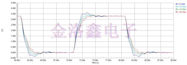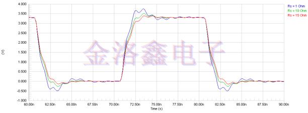 圖12:SiT8208貼片晶振使用星形拓?fù)潋?qū)動(dòng)兩條傳輸線的角落(溫度,電源電壓和工藝)的Altium Designer仿真波形(在負(fù)載側(cè))(圖11).走線阻抗-60Ω,走線段長(zhǎng)度-2in.,標(biāo)稱電源電壓-3.3V,Rs=10Ω,Rt=10Ω,CL=5pF.圖13和圖14顯示了模擬結(jié)果,說(shuō)明了信號(hào)波形如何分別隨Rt和Rs變化.